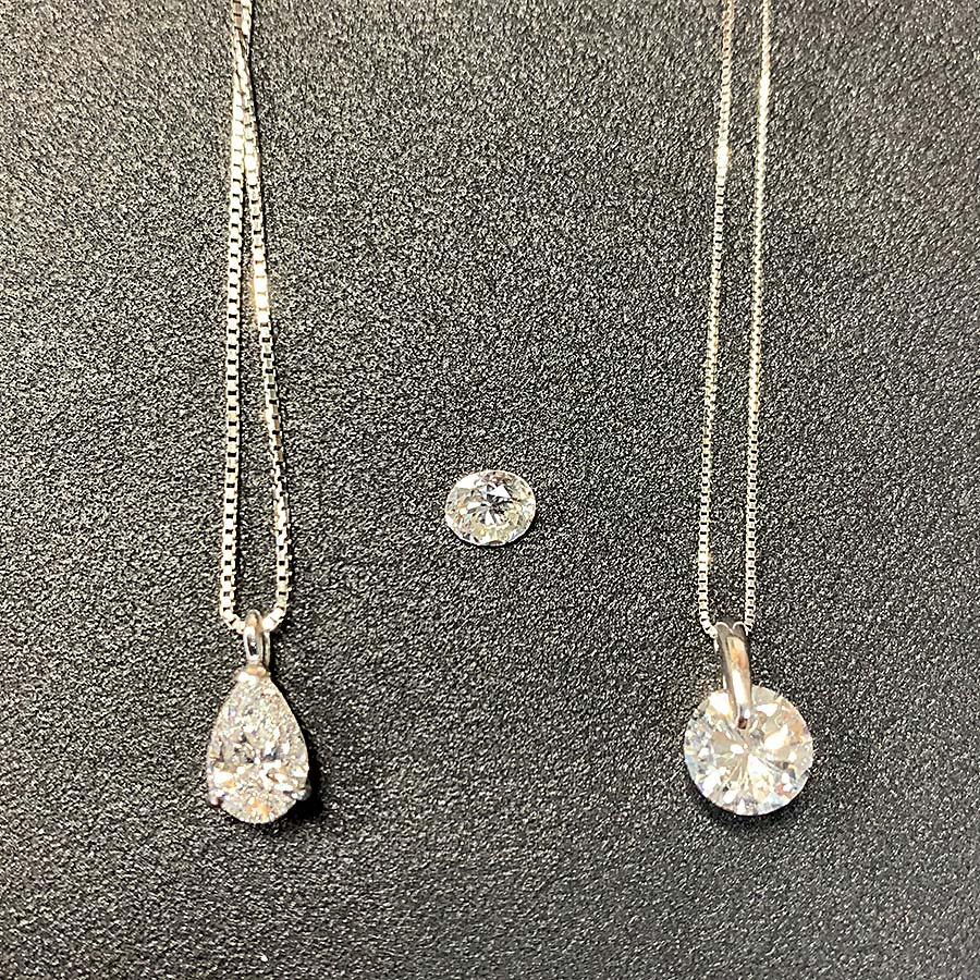• お客様よりペアシェイプダイヤネックレス・ラウンドブリリアントカットダイヤネックレス・立て爪リングの3つをお持ち込み頂き、ネックレスのチェーンを活かして揺れるピアスにリフォーム致しました。ピアス用のダイヤが一粒足りなかったので、立て爪リングのダイヤの4Cに合わせて一粒新たに選定致しました。一つ一つのジュエリーはスタイリッシュなデザインでしたが、組み合わせることでフェミニンで華やかな印象に変わりました。